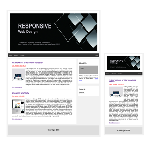 Artikel ini merupakan lanjutan dari pembahasan artikel sebelumnya Login dan Register Multi-User, jika pada pembahasan sebelumnya mengulas bagaimana membuat login Multi-User dan aplikasi penjualan sederhana, pada artikel ini akan membahas bagaimana membuat Responsive Web Design dan menampilkan berita pada halaman utama, yang diambil dari dua tabel baru yaitu "berita dan kategori". terdapat juga fitur read more berita menggunakan javascript. pada website responsive ini akan terhubung dengan program Login dan Register Multi-User, melalui tombol Login. untuk full program dapat didownload pada link ini
